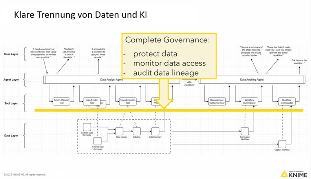 Die kostenlose Open-Source-Plattform KNIME Analytics Platform ermöglicht es Nutzerinnen und Nutzern aus verschiedenen Bereichen – ob geschäftlich, technisch oder datenwissenschaftlich – täglich intuitiv mit Daten zu arbeiten. Dank der benutzerfreundlichen grafischen Oberfläche bietet KNIME Einsteigern einen leichten Zugang zur Welt der Datenwissenschaft. Erfahrene Anwender profitieren von erweiterten Analysemöglichkeiten, der Integration von Skriptsprachen, Machine-Learning-Bibliotheken und anderen Tools. So bietet KNIME eine leistungsstarke Lösung für eine breite Palette von Datenanalyseaufgaben und schafft eine gemeinsame Basis für Nutzer mit unterschiedlichen Erfahrungsstufen und Fachkenntnissen. Dieser gemeinsame Ansatz fördert Wissensaustausch und Innovation in der praktischen Anwendung von Data Science.